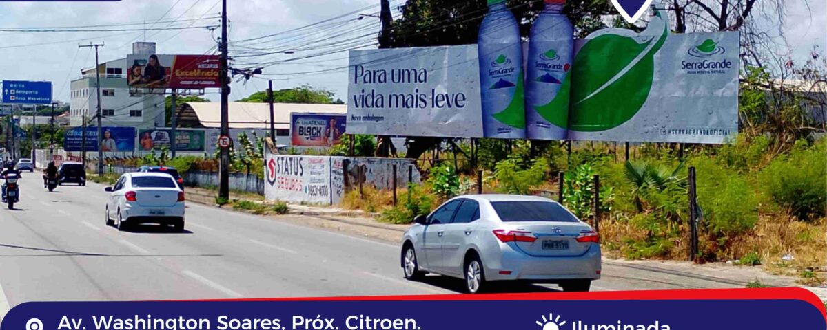 Endereço: Av. Washington Soares, próximo a Citroen Tipo: Iluminado Bairro: Água Fria Visão: Unifor Cidade: Fortaleza – CE Referências: Supermercados, faculdades, restaurantes, acesso à Seis Bocas.
