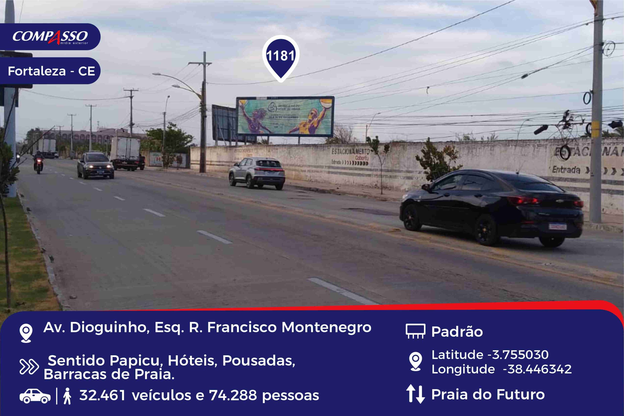 Endereço: Av. Dioguinho Tipo: Padrão Bairro: Praia do Futuro Visão: Av. Santos Dumont Cidade: Fortaleza – CE Referências: Hotéis, pousadas, barracas de praia.
